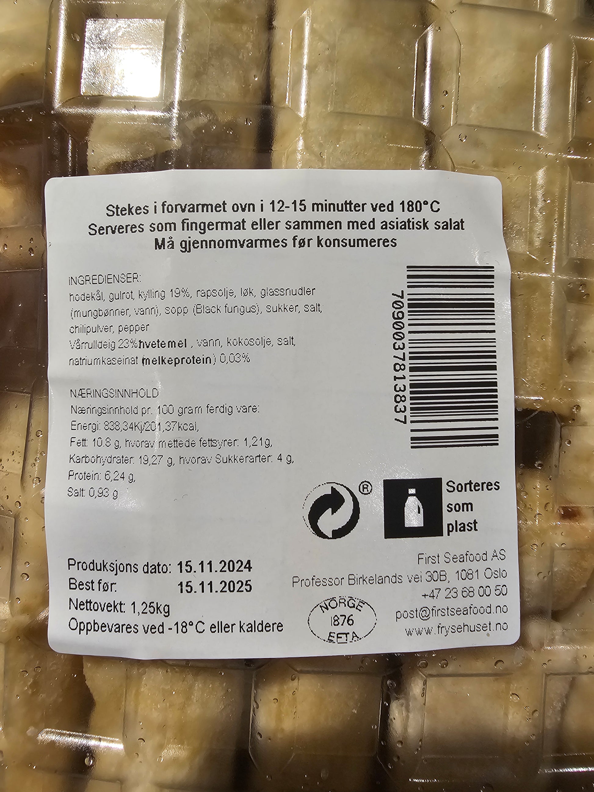 Fyll: Hodekål, gulrot, kylling (19 %), rapsolje, løk, glassnudler (mungbønner, vann), sopp (black fungus), sukker, salt, chilipepper, pepper.